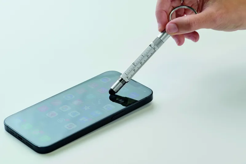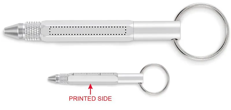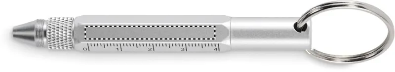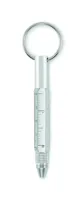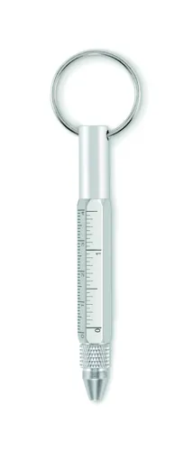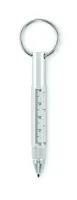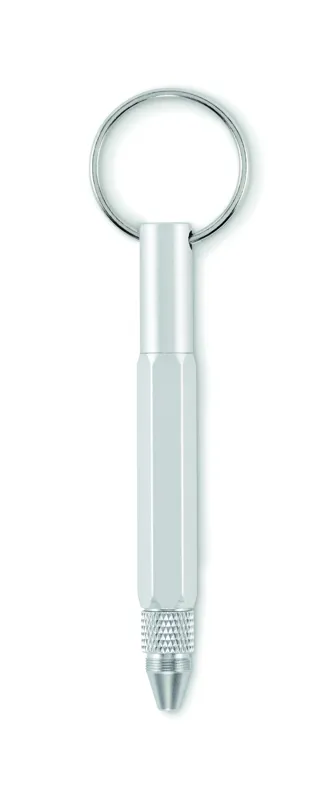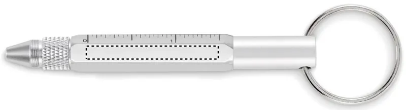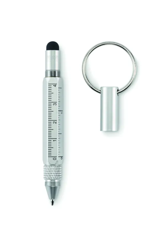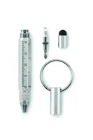 Kulcstartó csavarzáras golyóstollal újrahasznosított alumíniumból, 4 cm-es és 1 ,5 colos mini vonalzóval, érintőheggyel és 2 az 1-ben lapos- és csillag csavarhúzóval. Feketén író betéttel.