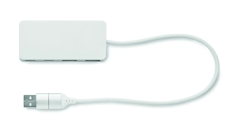 4 portos USB hub újrahasznosított alumínium házban, diófa részlettel a tetején. Kimenet: 2x USB-A és 2x C-típusú. Bemenet: 2 az 1-ben C-típusú és USB-A. Kábel hossza: 27,5 cm.