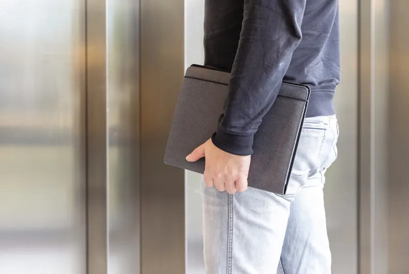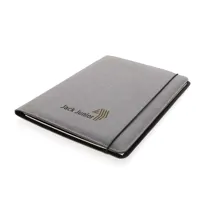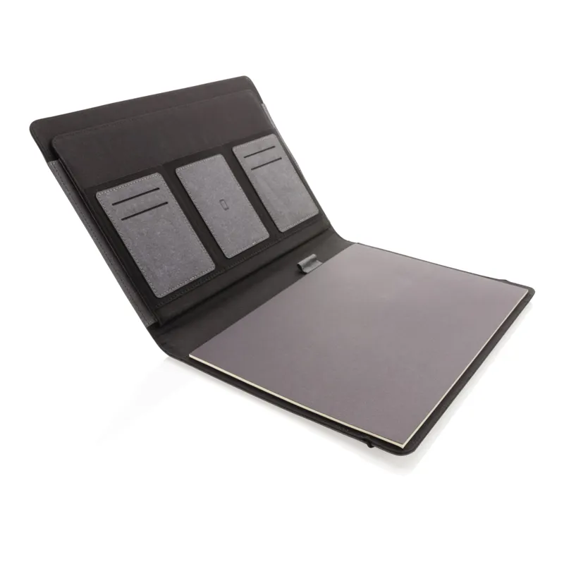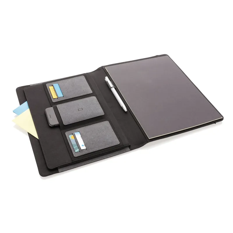 A4-es méretű mappa újrahasznosított bőrből a kifinomult munkához. Tárolja dokumentumait, névjegykártyáit és jegyzeteit ebben a gumis záródású mappában vonalas, 64g/m2 újrahasznosított papírból készült, 20 oldalas jegyzettömbbel. Egy nagyobb zsebbel, 3 mobiltelefon méretű zsebbel valamint 4 névjegykártyatartó zsebbel.