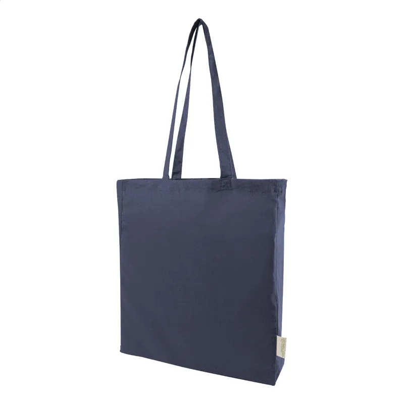 Bevásárlótáska betoldással és hosszú fülekkel, 70% újrahasznosított pamutból és 30% RPET poliészterből, 140 g/m². Megkülönböztető újrahasznosított pamut címkével.