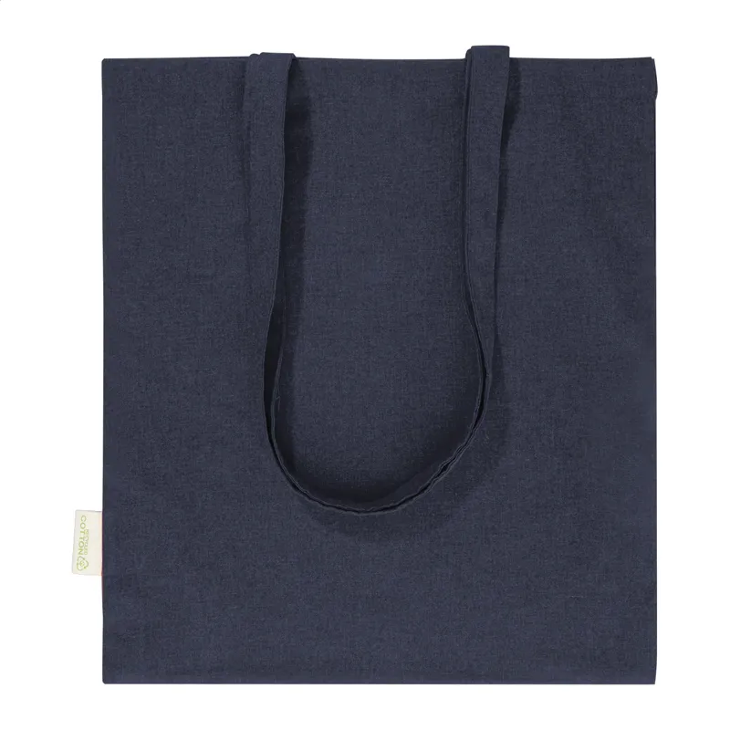 Bevásárlótáska hosszú fülekkel, 70% újrahasznosított pamutból és 30% RPET poliészterből, 140 g/m². Megkülönböztető újrahasznosított pamut címkével.