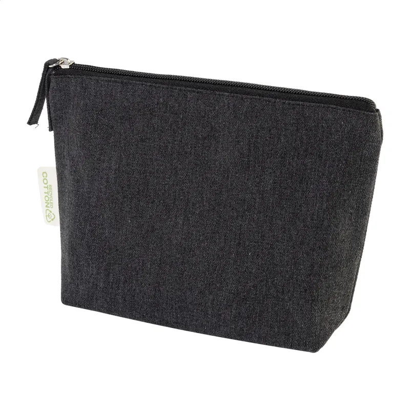 Cipzáras kozmetikai táska 70%-ban újrahasznosított pamutból és 30% RPET poliészterből, 280 g/m². Megkülönböztető újrahasznosított pamut címkével.