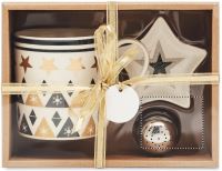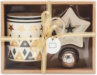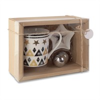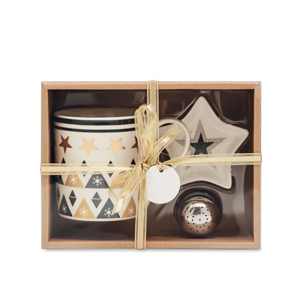 Szett kerámia bögrével, teatojással és mini tányérral. Kartondobozban PVC borítóval és kártyával ellátott zsinórral.