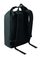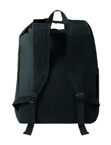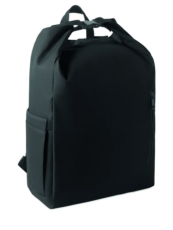 15 colos, csavart záródású rolltop laptop hátizsák 600D RPET poliészterből, párnázott 210D RPET béléssel. Cipzáras elülső zsebbel, rugalmas oldalzsebbel és állítható vállpántokkal.