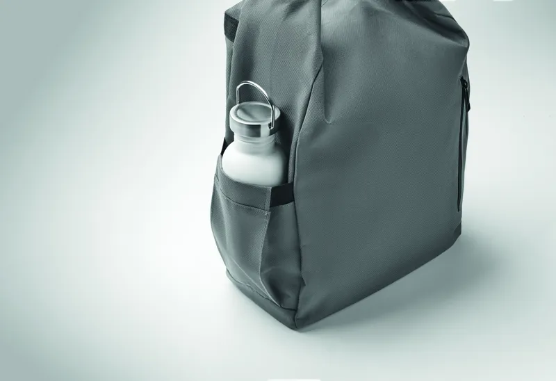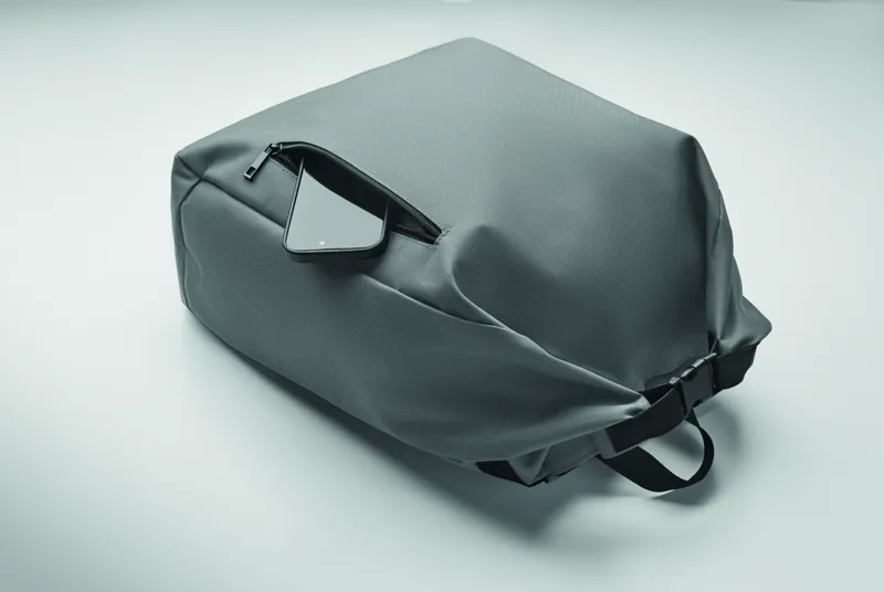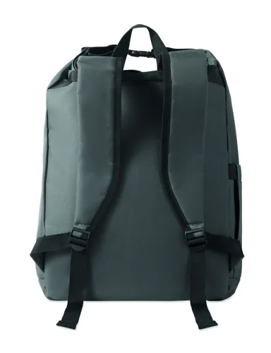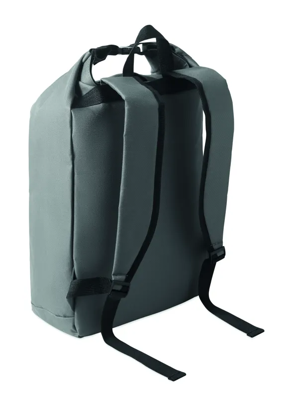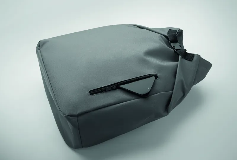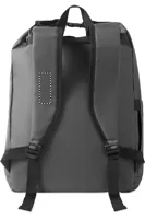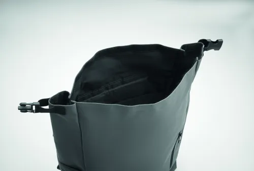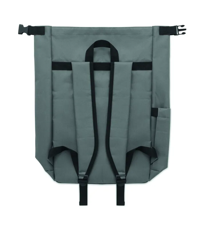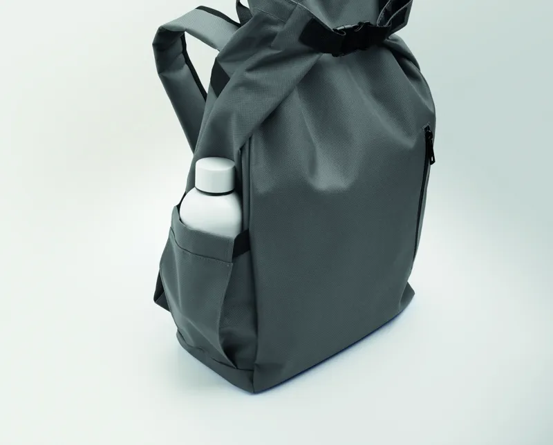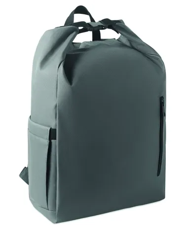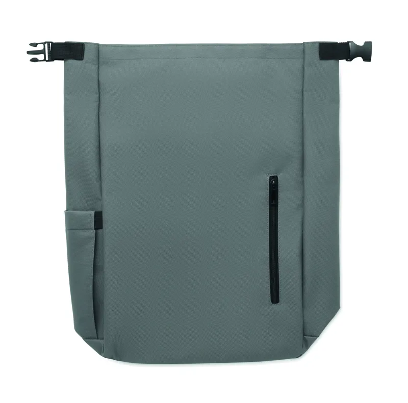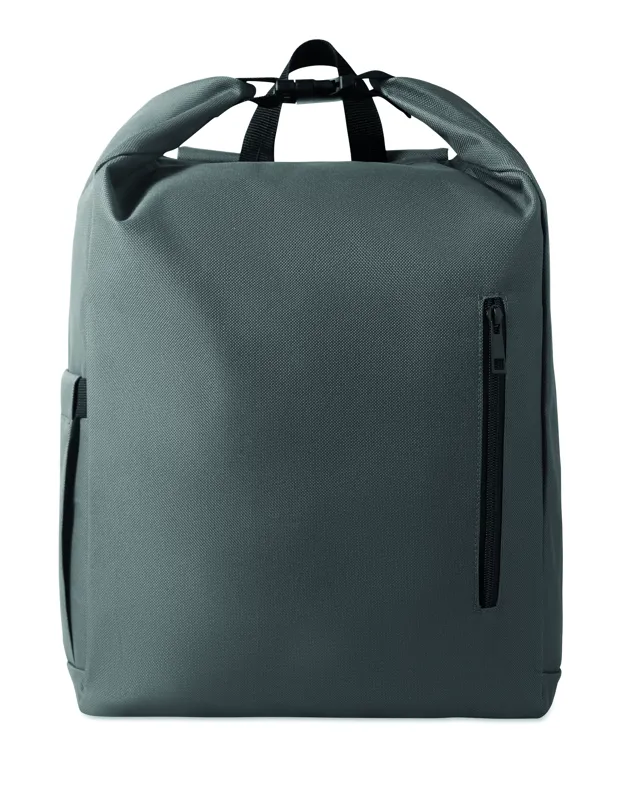 15 colos, csavart záródású rolltop laptop hátizsák 600D RPET poliészterből, párnázott 210D RPET béléssel. Cipzáras elülső zsebbel, rugalmas oldalzsebbel és állítható vállpántokkal.