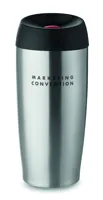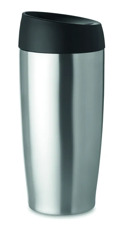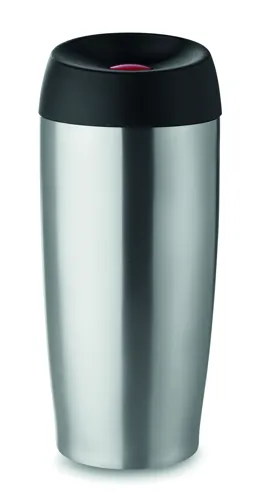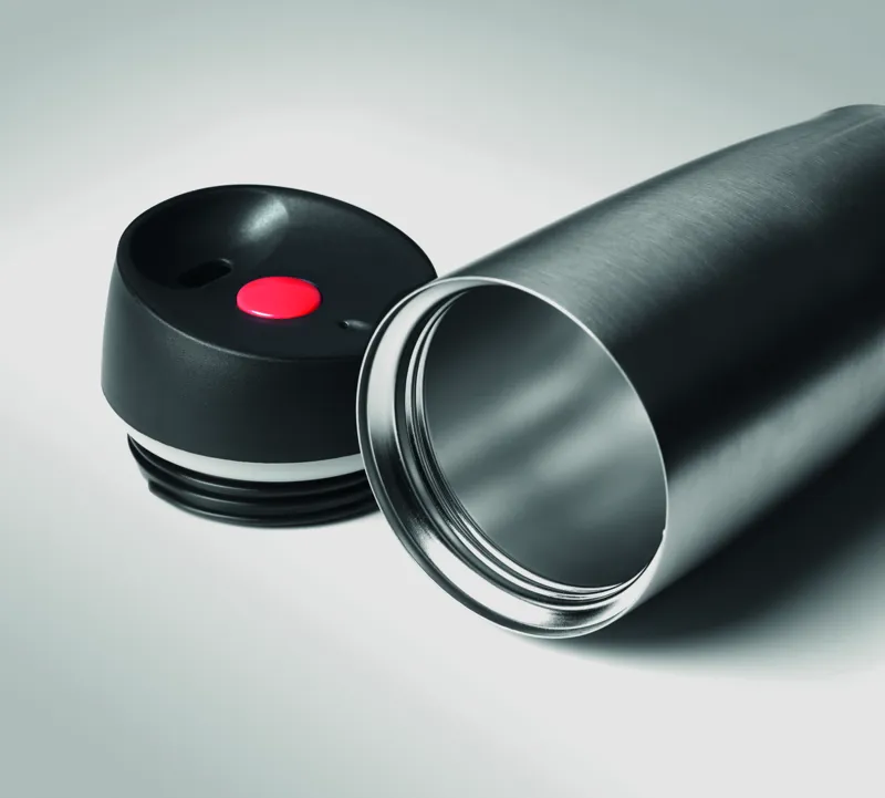 Duplafalú rozsdamentes acél úti bögre. Szivárgásmentes, biztonságos nyitó/záró nyomógomb. Űrtartalom: 350 ml. Szivárgásmentes.