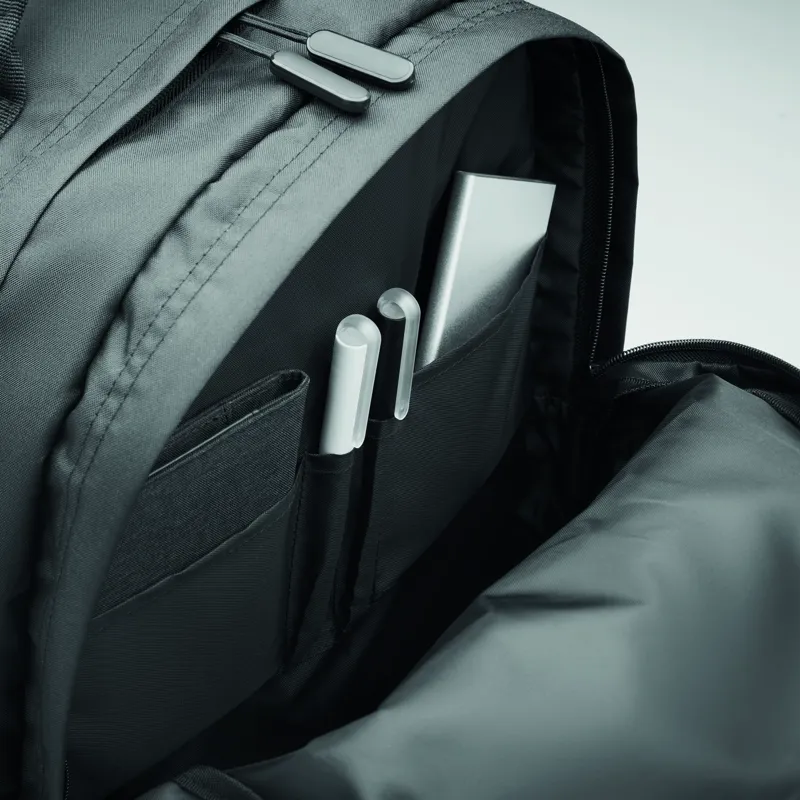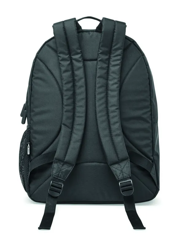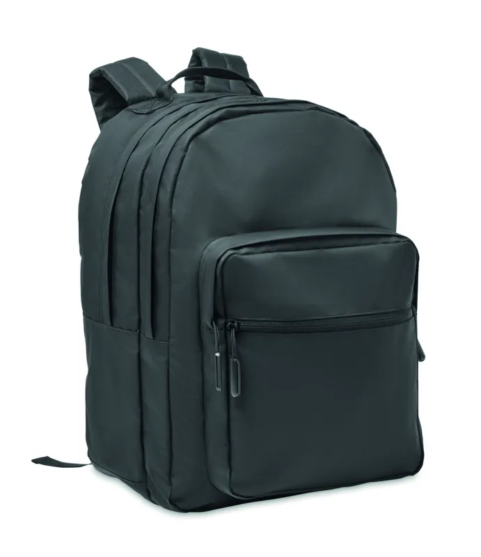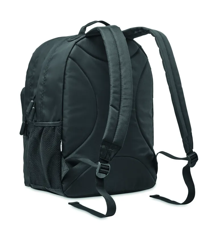 15 colos laptop hátizsák 300D RPET poliészterből. 2 nagy cipzáras rekesszel, dupla cipzáras elülső zsebbel és hálós oldalzsebbel rendelkezik. Párnázott hát, alj és vállpántok.