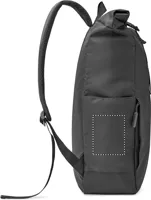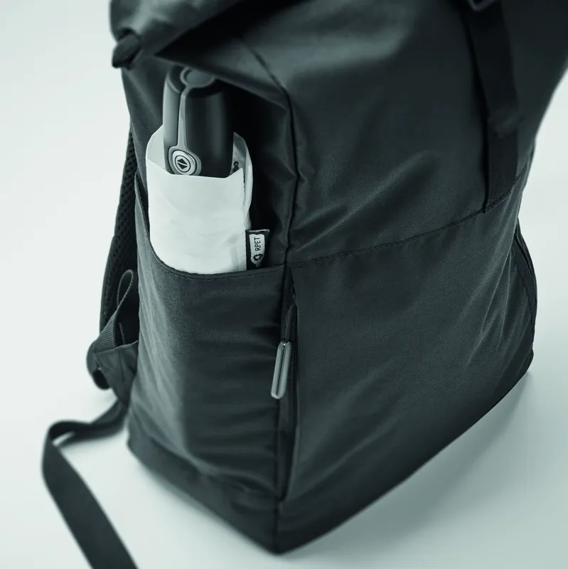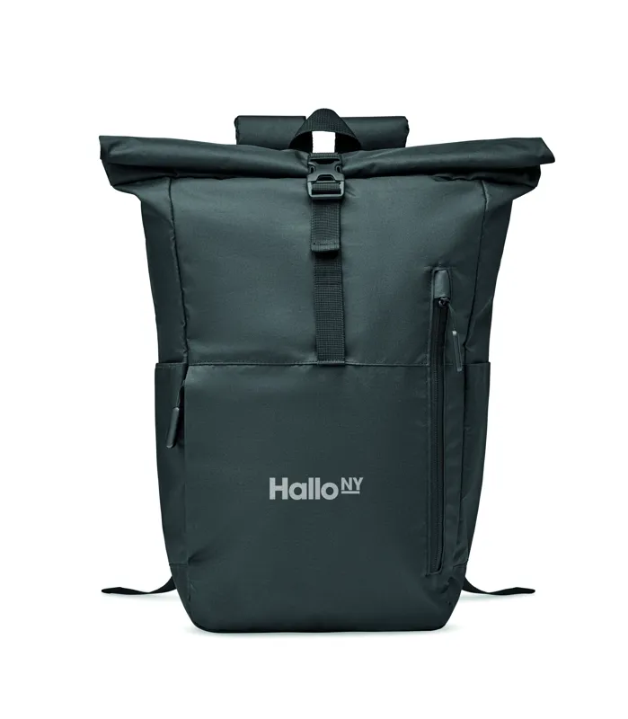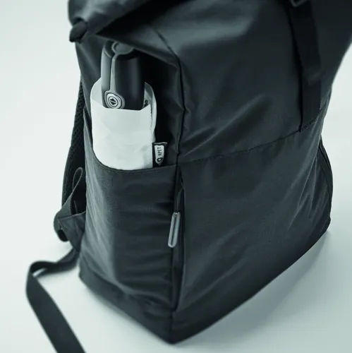 15 colos roll top csavart záródású laptop hátizsák 300D RPET poliészterből. Nagy cipzáras elülső zseb, rejtett oldalzseb kis karabinerhurokkal a belsejében. A karabiner hegymászásra, védőfelszerelés céljára nem alkalmas.