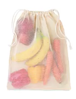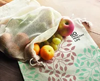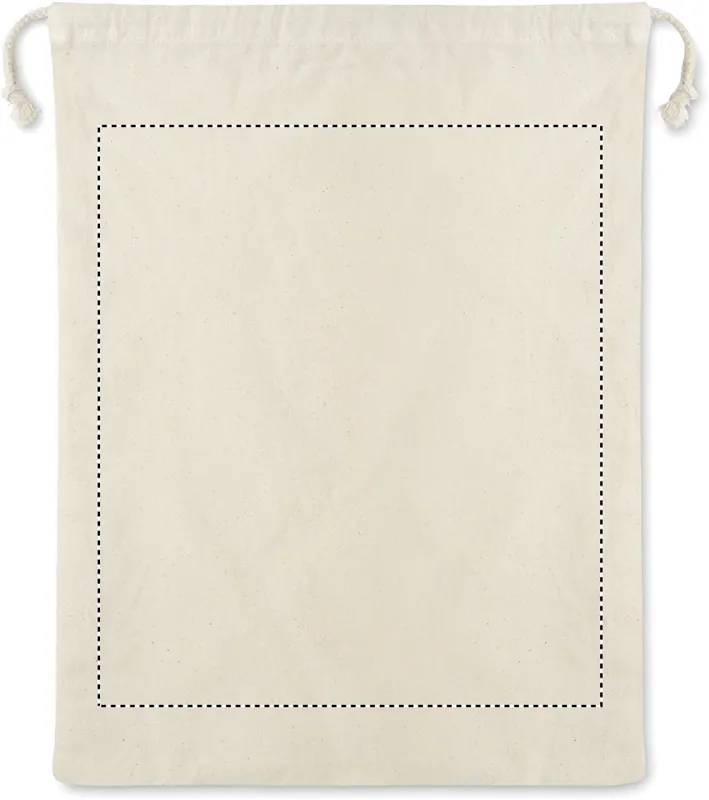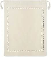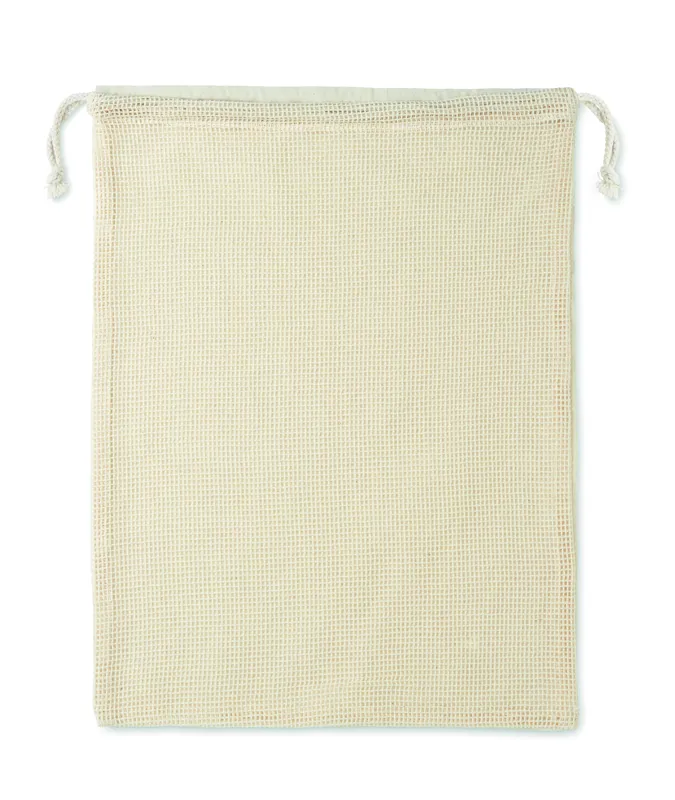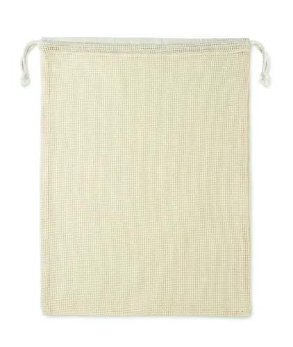 Többször használható, húzózsinóros zsák, bevásárlásokhoz. Egyik oldala 140 g vastag pamutvászon, a másik 110 g vastag hálós pamut anyag.
