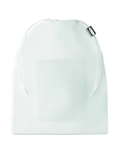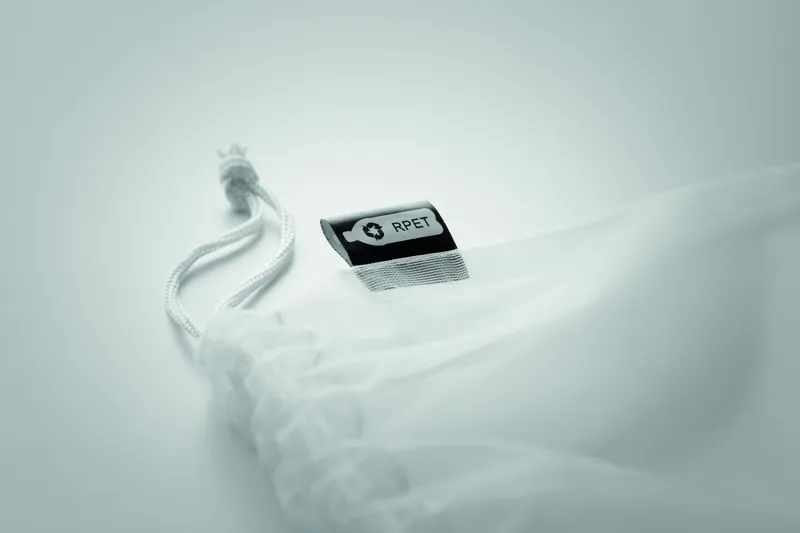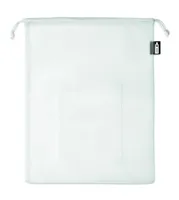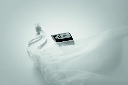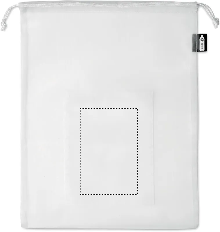 Hálós RPET anyagból készült húzózsinóros zsák, bevásárlásokhoz. Elől zsebbel, a tetején PP húzózsinórral.