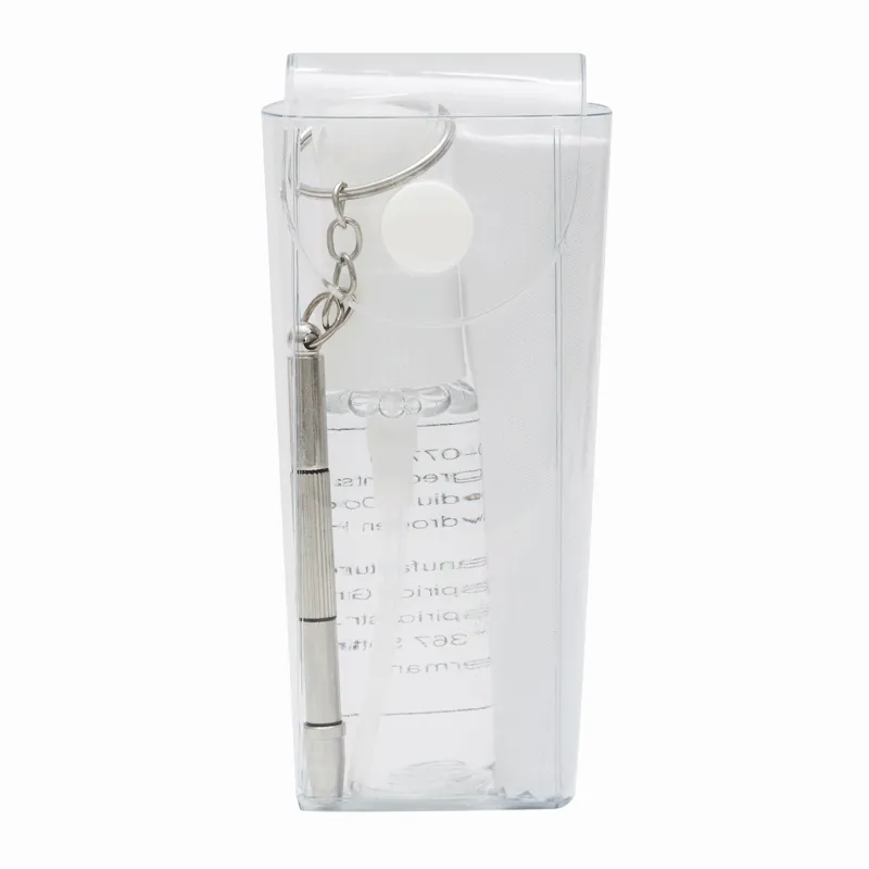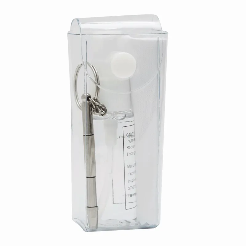 VIEW szemüvegtisztító szett tisztító folyadékot tartalmazó üvegcse (kb.20ml), tisztító kendő, mini csavarhúzó kulcstartóval, patentos PVC tartóban