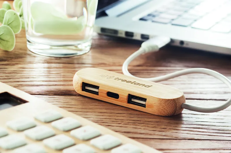 3 portos 2.0 USB elosztó bambusz házban, C típusú csatlakozóval, 2 az 1-ben kábellel. Kábel hossza 24 cm. A bambusz természetes anyag, színében, mintázatában és méretében esetenként eltérő lehet.