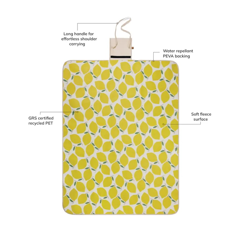Dobja fel a szabadtéri kalandokat. Puha gyapjúfelülettel, élénk citrommintával és kényelmes, vízlepergető PEVA hátoldallal. A pamutvászon pánttal és hosszú fogantyúval ellátott, intelligens kialakításnak köszönhetően a takaró könnyen összehajtható és hordozható, a strandra és a parkba egyaránt tökéletes. A GRS (Global Recycled Standard) tanúsítvány garantálja az újrahasznosított anyagok ellátási láncát. A teljes újrahasznosított anyagtartalom a termék összsúlyán alapul. 51% GRS újrahasznosított PET-et tartalmaz.