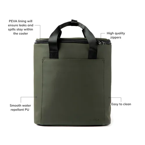 Vízlepergető nubuk PU-ból készült, minimalista hűtő hátizsák. Extra vastag habbal szigetelt és úgynevezett PEVA-val bélelt, amely egy könnyedén tisztán és frissen tartható anyag. Fantasztikus hátizsák strandra, hajóra, vagy egy vadonbeli kalandra.
