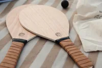 Elegáns strandtenisz készlet. Nyárfából készült, PU markolattal a kényelmesebb fogás érdekében. Könnyen elsajátítható. Fiataloknak és időseknek egyaránt megfelel. Két ütőt és két gumilabdát tartalmaz. Pamuttáskában, amelynek hátoldala hálós, így könnyen hordozható. Kizárólag száraz felületeken való használatra készült. Nem alkalmas vízben való használatra.