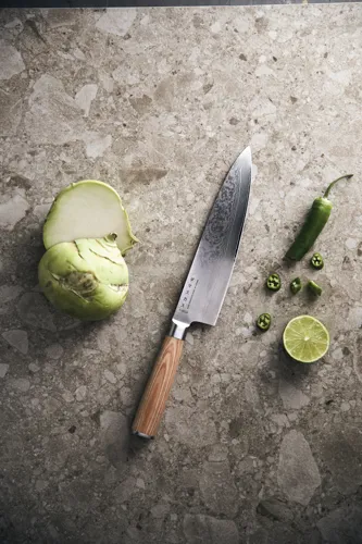 Ez a szakácskés ideális hús és nagyobb zöldségek darabolásához vagy fűszernövények aprításához. A masszív, ergonomikus kialakítású pakkafa markolat megkönnyíti és kényelmessé teszi a kés használatát. Ez azt jelenti, hogy hosszú ideig dolgozhat vele anélkül, hogy elfáradna a keze. A penge hihetetlenül kemény VG10 acél maggal rendelkezik amelyet 67 acélrétegből öntöttek. Az eredmény egy tartós penge, hihetetlen élességgel és kiemelkedő vágási teljesítménnyel.