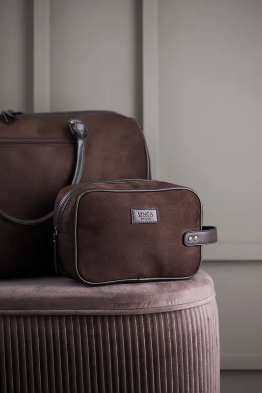 Klasszikus mégis modern piperetáska velúrutánzatból, PU bőr alkotóelemekkel. A táska megkönnyíti a higiéniai cikkek stílusos tárolását mind otthon, mind utazás közben. A táska praktikus méretben kapható és könnyen hordozható a rövid oldalán lévő sárgaréz alkotóelemekkel ellátott pántnak köszönhetően.