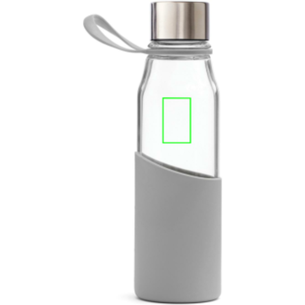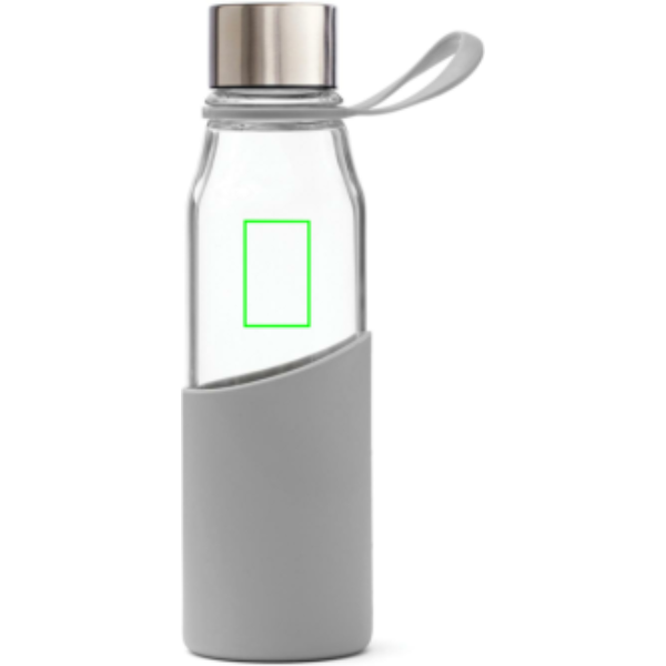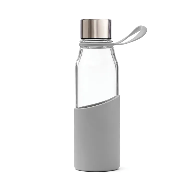 Szilikonhüvellyel ellátott, elegáns üvegből készült vizespalack. A hüvely kellemes fogást biztosít, és védi a palackot a külső behatásoktól. Egyszerű és stílusos kialakítás. A palack boroszilikát üvegből készült, egy olyan üvegtípusból, amely ellenállóbb a hőhatással szemben, mint a közönséges üveg. A boroszilikát egy rendkívül tartós és minőségi anyag, amely tartós és ellenáll a legtöbb ütésnek.