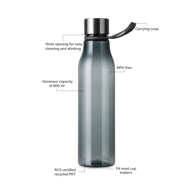 BPA-mentes, RCS újrahasznosított PET-ből készült vizespalack. A nagy, 800 ml-es űrtartalmával edzéshez, utazáshoz ideális, vagy amikor extra folyadékpótlásra van szüksége. A termékhez tartozó hurok kényelmes fogantyúként is használható, így tökéletesen alkalmas az útközbeni hordozásra vagy az edzőeszközökre való felakasztásra. Ideális formája lehetővé teszi, hogy a legtöbb pohártartóba illeszkedjen. Kizárólag hideg italokhoz. Kizárólag kézzel mosható. Az RCS (Recycled Claim Standard) tanúsítvány biztosítja az újrahasznosított anyagok ellátási láncát. 68% RCS újrahasznosított PET-et tartalmaz.