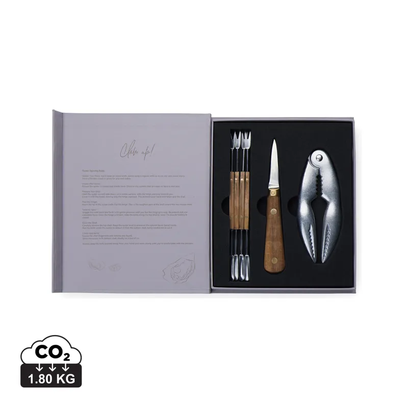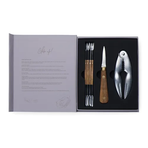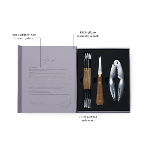 Merüljön el a tenger gyümölcseinek csodálatos világában a Story of Seafood készlettel, amely elegánsan egy klasszikus könyvre emlékeztető FSC® ajándékdobozban érkezik. Ez a gondosan összeállított készlet egy osztrigakést, egy kagylótörőt és négy tenger gyümölcsei villát tartalmaz, amelyek mind rozsdamentes acélból és FSC® kőrisfából készültek precízen. Az egyedi csomagolás nemcsak az eszközöket védi, hanem a tenger gyümölcseinek magával ragadó történetét is elmeséli, így ideális ajándék a tenger gyümölcsei szerelmeseinek.