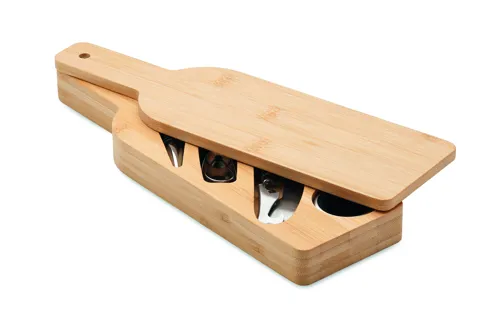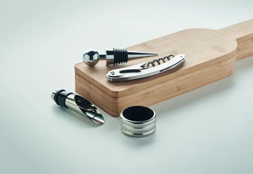 Boros készlet palack alakú bambusz tokban. Dugóhúzót, kiöntőt, palack visszazárót és cseppfogó gyűrűt tartalmaz.