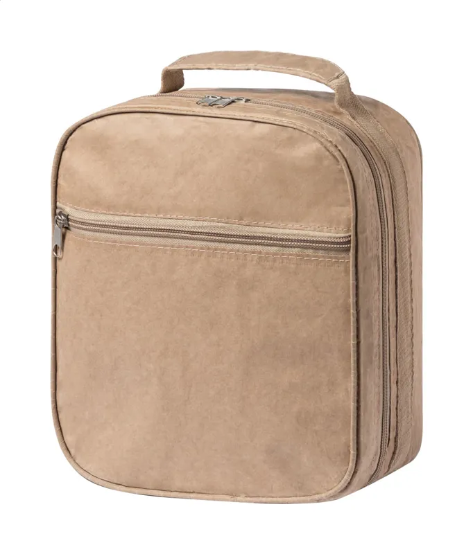 Cipzáras, laminált újrahasznosított papír hűtőtáska alumínium béléssel és elülső zsebbel.