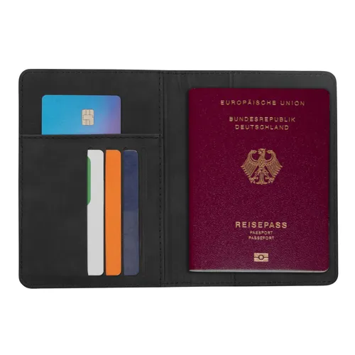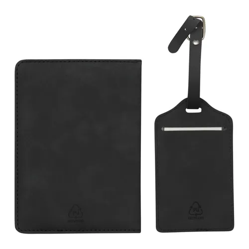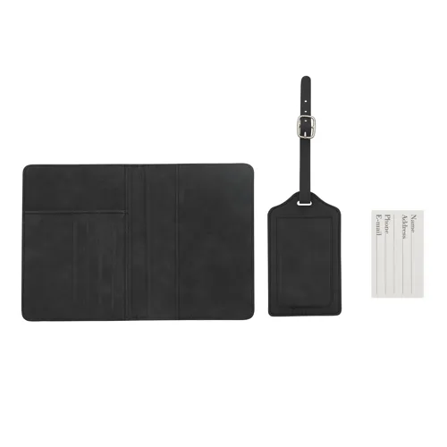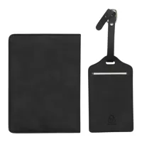 VISA utazókészlet, 2 darabos: tartalmaz egy útlevéltartót 4 kártyahellyel, 1 beszállókártyáknak való rekeszt, 1 rekeszt az útlevél számára, rugalmas szalaggal záródó, valamint egy adatvédelmi fedéllel ellátott bőröndcímkét a személyes adatok védelme érdekében, valamint egy csatos pántot, ajándékdobozban