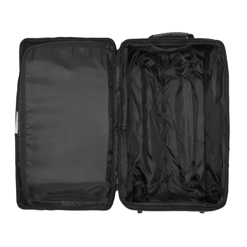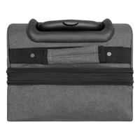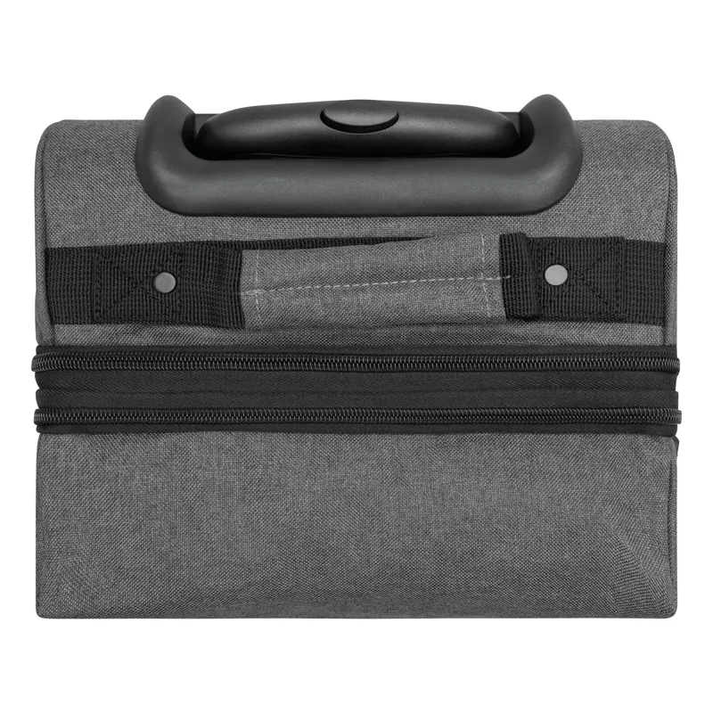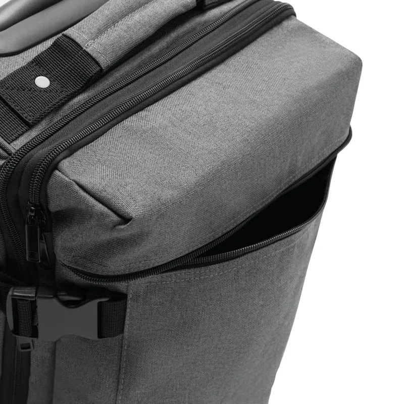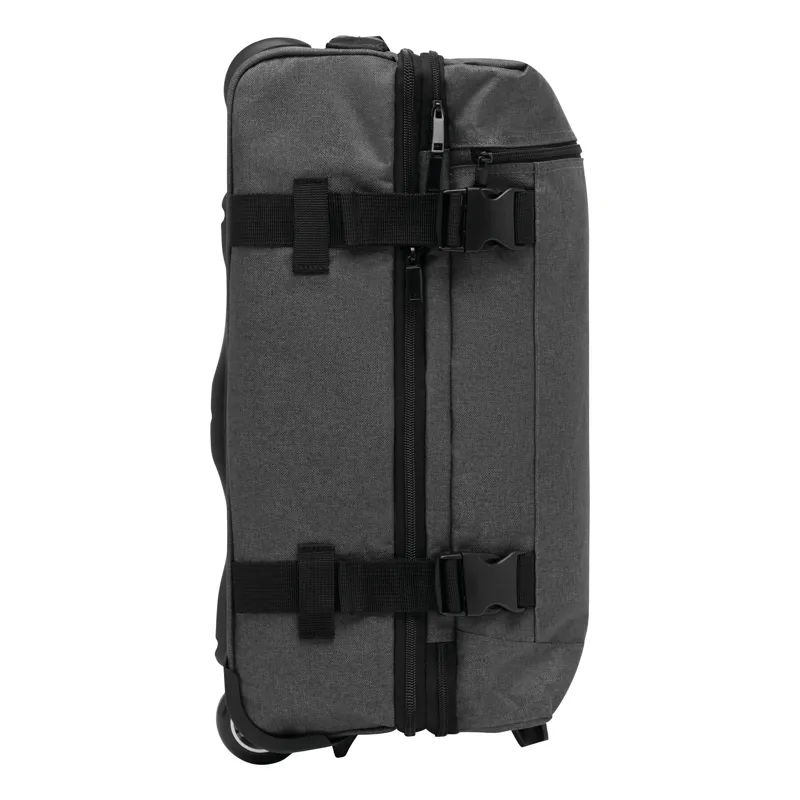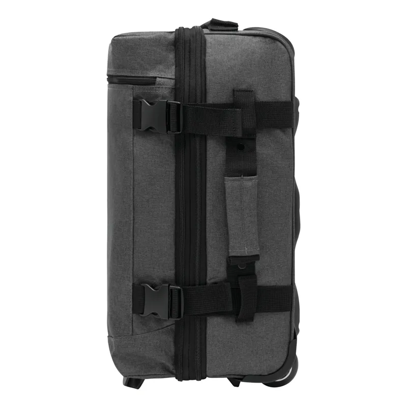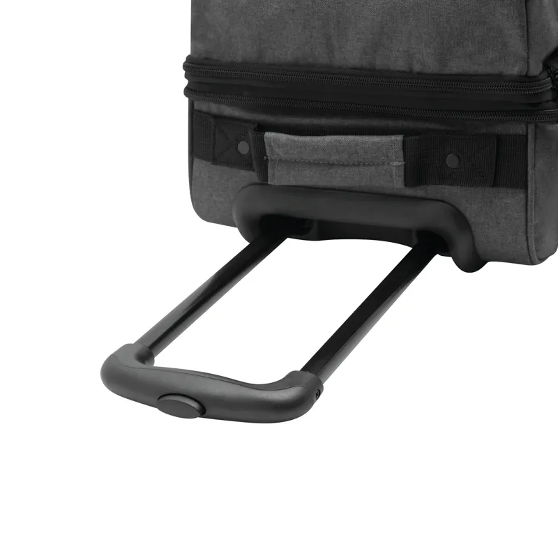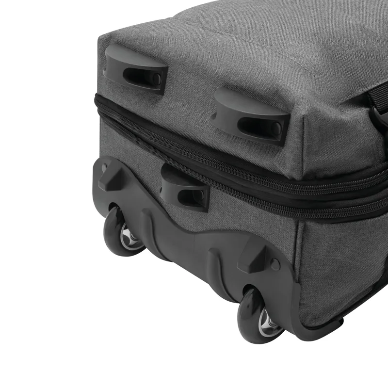 VISBY gurulós utazótáska: cipzáras első zseb, a fő rekesz külön cipzárral további kb. 10%-kal több tároló kapacitással, 2 db összehúzó pánt csatokkal mindkét oldalon, 2 db párnázott fül, kihúzható fogantyúval, könnyen gördülő kerekeken, sarokvédelemmel, 2 db csúszásvédővel, és letámasztóval