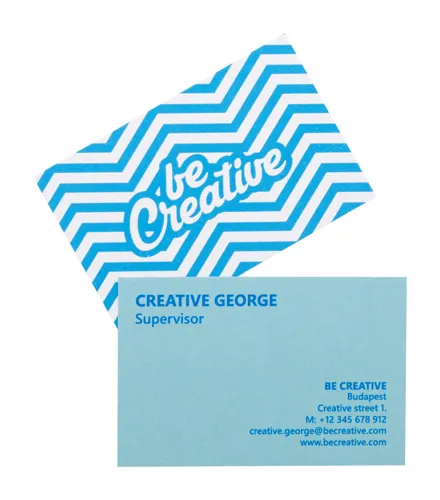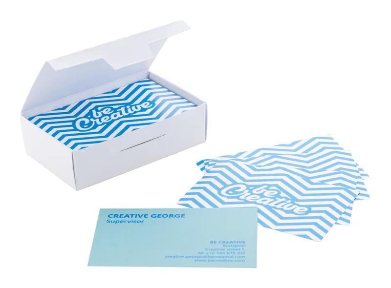100 db egyedi gyártású, vízálló és szakadásmentes papír névjegykártya, mindkét oldalán full colour nyomtatott grafikával. Fehér papírdobozban. A feltüntetett ár egy doboz 100 db-os névjegykártyára vonatkozik.
