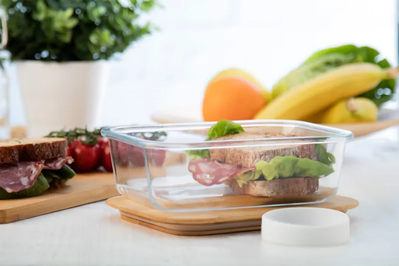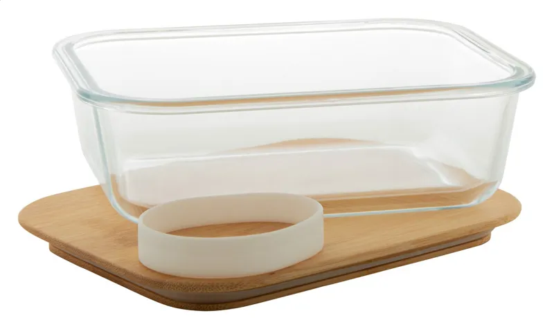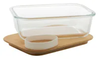 Üveg uzsonnás doboz természetes bambusz fedéllel és szilikon pánttal, 800 ml.