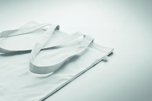 Fogyasztás előtti újrahasznosított pamut bevásárlótáska (70% újrahasznosított pamut és 30% RPET), hosszú fülekkel. 140 g/m². Ez az anyag nyomtatás után zsugorodhat.
