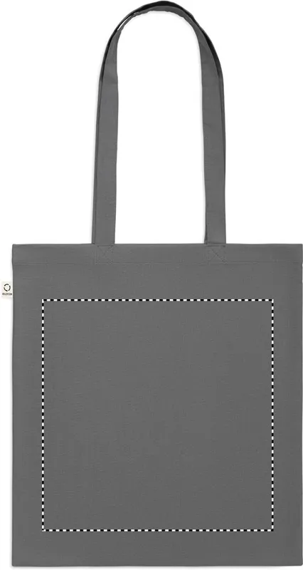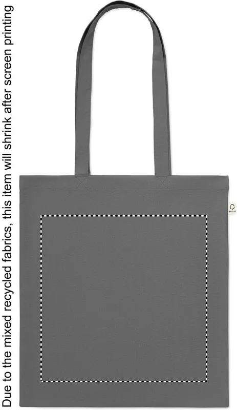 Fogyasztás előtti újrahasznosított pamut bevásárlótáska (70% újrahasznosított pamut és 30% RPET), hosszú fülekkel. 140 g/m². Ez az anyag nyomtatás után zsugorodhat.