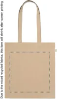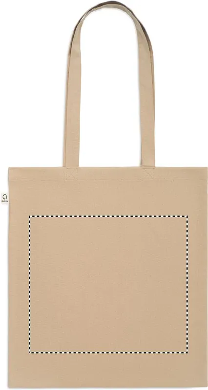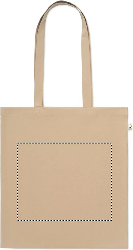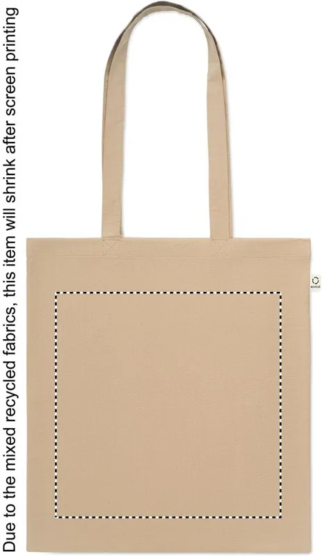 Fogyasztás előtti újrahasznosított pamut bevásárlótáska (70% újrahasznosított pamut és 30% RPET), hosszú fülekkel. 140 g/m². Ez az anyag nyomtatás után zsugorodhat.