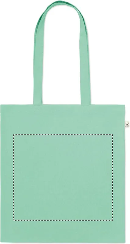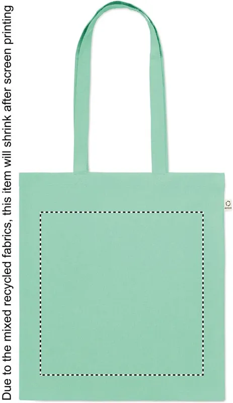 Fogyasztás előtti újrahasznosított pamut bevásárlótáska (70% újrahasznosított pamut és 30% RPET), hosszú fülekkel. 140 g/m². Ez az anyag nyomtatás után zsugorodhat.