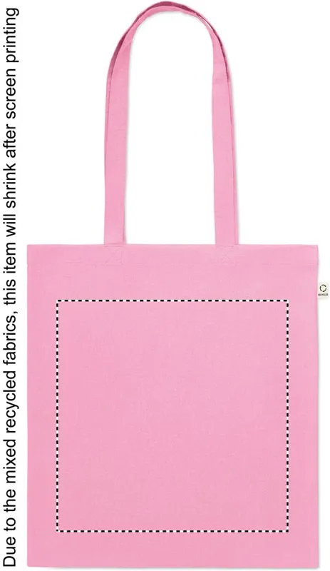 Fogyasztás előtti újrahasznosított pamut bevásárlótáska (70% újrahasznosított pamut és 30% RPET), hosszú fülekkel. 140 g/m². Ez az anyag nyomtatás után zsugorodhat.