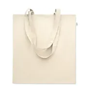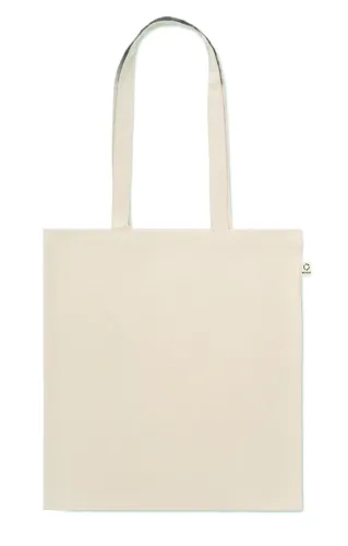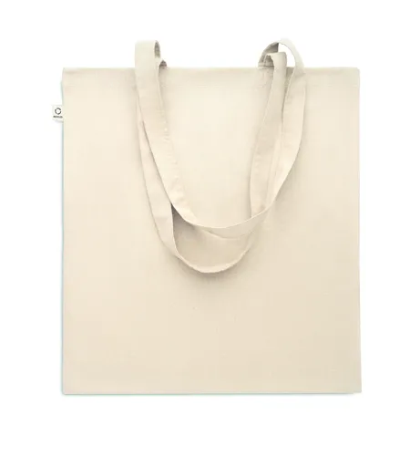 Fogyasztás előtti újrahasznosított pamut bevásárlótáska (70% újrahasznosított pamut és 30% RPET), hosszú fülekkel. 140 g/m². Ez az anyag nyomtatás után zsugorodhat.