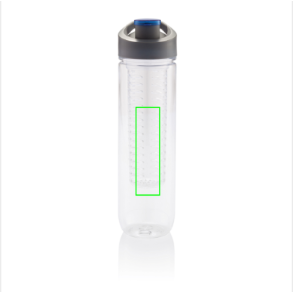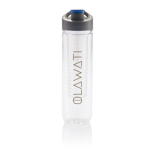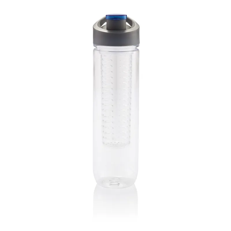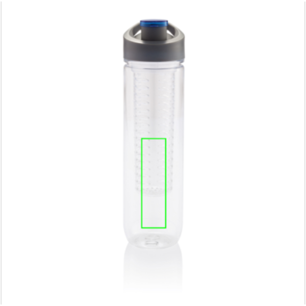 Tritán vizespalack gyümölcstartó egységgel. A 800 ml-es üveg szűrőjébe különböző gyümölcsöket helyezhet, ezáltal megkönnyítve a megfelelő mennyiségű folyadékbevitelt ízekkel és vitaminokkal bolondítva. Amennyiben jégkockákat is helyez a szűrőbe még üdítőbb élményben lesz részünk.