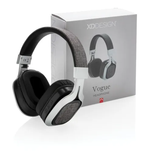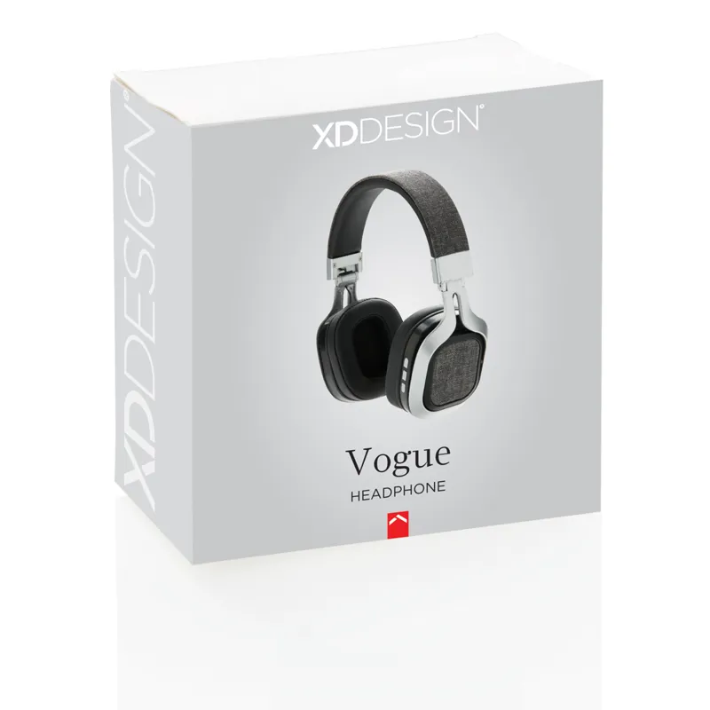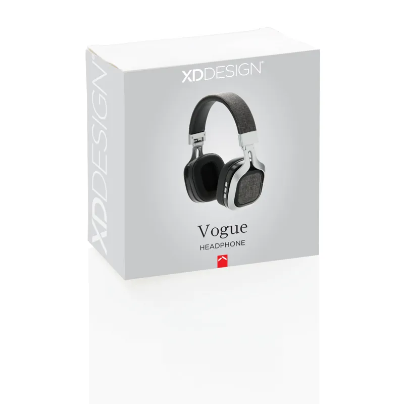 A Vogue fejhallgató egy divatos, szövet borítású fejhallgató. Teljesen lefedi a fület így amellett, hogy kényelmes viselet a zene minősége is garantált. A fül résznél kényelmes PU anyaggal. Összehajtható így könnyen szállítható. 4.0-ás vezeték nélküli kapcsolat, 10 méteres hatótávolság. Beépített 200 mAh akkumulátor az akár 6 órán át tartó zenehallgatáshoz. Handsfree funkció a hívások megválaszolásához. Micro USB kábellel érkezik. Bejegyzett design®