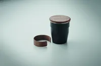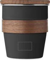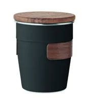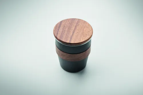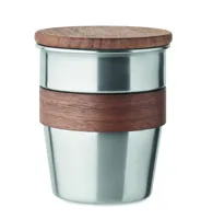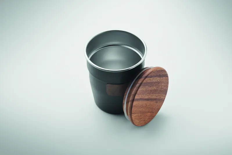 Szimplafalú pohár újrahasznosított rozsdamentes acélból (90% újrahasznosított rozsdamentes acél és 10% rozsdamentes acél), diófa markolattal és fedéllel. Űrtartalom: 350 ml. A mosogatáshoz távolítsa el a markolatot. Mivel ez egy szimplafalú bögre, hőátadás lehetséges.