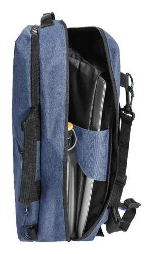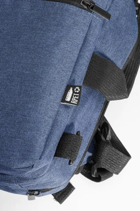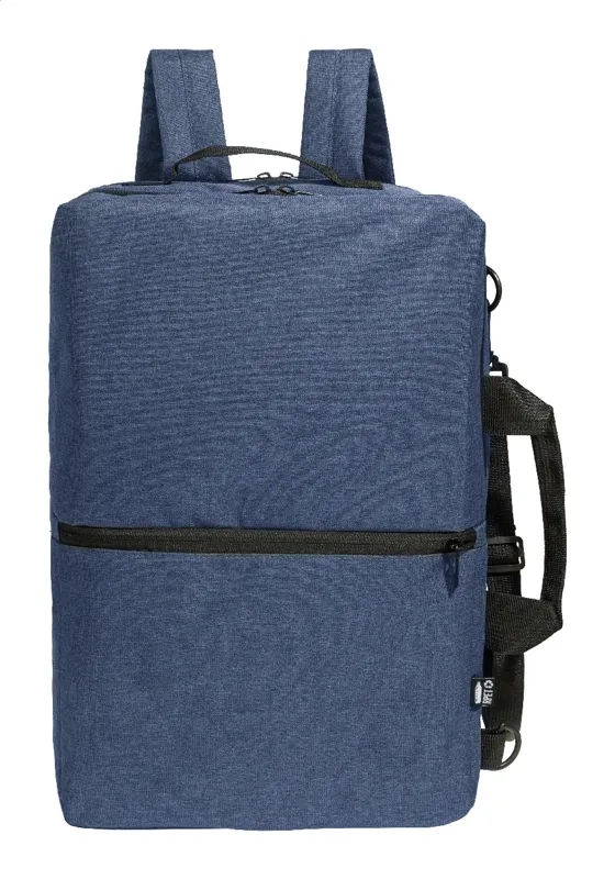 Kétfunkciós RPET dokumentum hátizsák cipzáras rekesszel, 2 cipzáras elülső zsebbel és párnázott laptop rekesszel (15"). Párnázott hátrésszel és vállpántokkal. Tartalmaz egy további levehető vállpántot, amely irattáskaként is használható. 600D RPET poliészter, megkülönböztető RPET címkével.