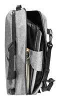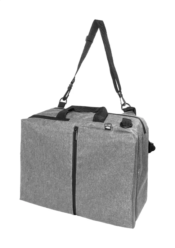 Kétfunkciós RPET dokumentum hátizsák cipzáras rekesszel, 2 cipzáras elülső zsebbel és párnázott laptop rekesszel (15"). Párnázott hátrésszel és vállpántokkal. Tartalmaz egy további levehető vállpántot, amely irattáskaként is használható. 600D RPET poliészter, megkülönböztető RPET címkével.