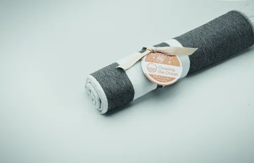 Újrahasznosított hamam vagy strandtörölköző. 70% újrahasznosított pamut és 30% újrahasznosított SEAQUAL® YARN poliészter. 300 g/m². 100x170 cm. A SEAQUAL INITIATIVE világszerte az óceánokat tisztító szervezetekkel dolgozik együtt, hogy értéket adjon a visszanyert hulladéknak. EU-ban gyártva.