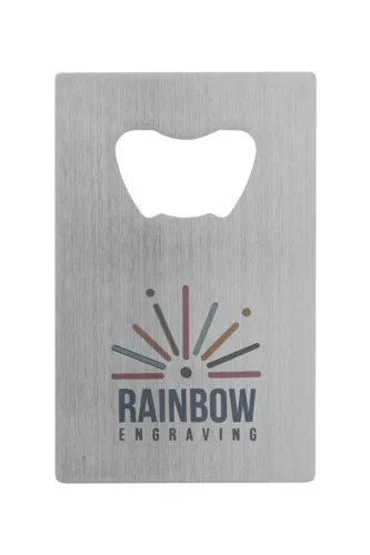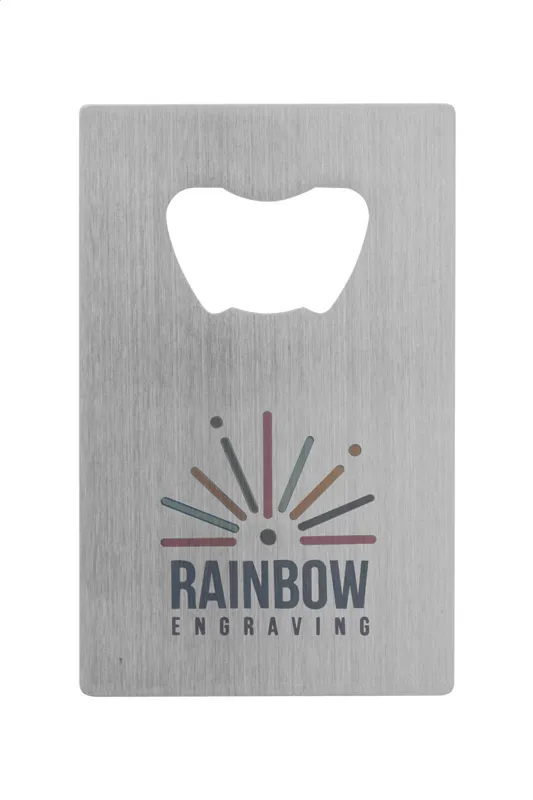 Rozsdamentes acélból készült bankkártya alakú üvegnyitó.