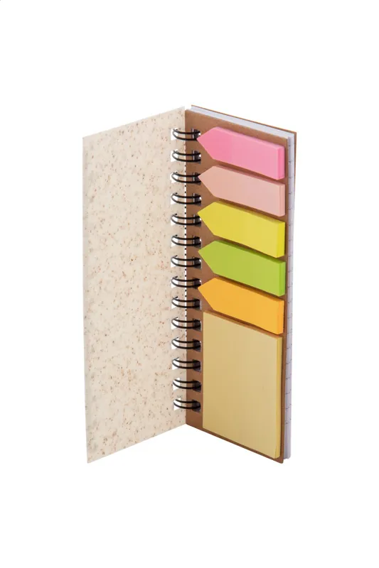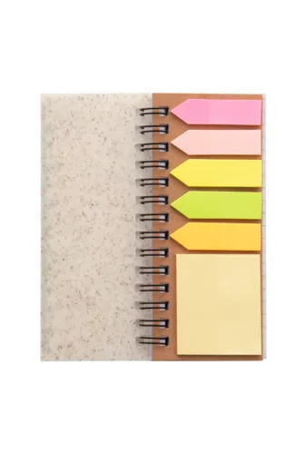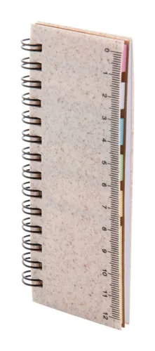 Ökológiai búzaszalma műanyag borítású spirálfüzet 40 vonalas lappal újrahasznosított papírból, 25 öntapadós jegyzetlappal és 125 oldaljelölővel (5 különböző színben). 12 cm-es vonalzóval a borítón.