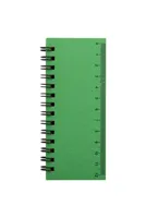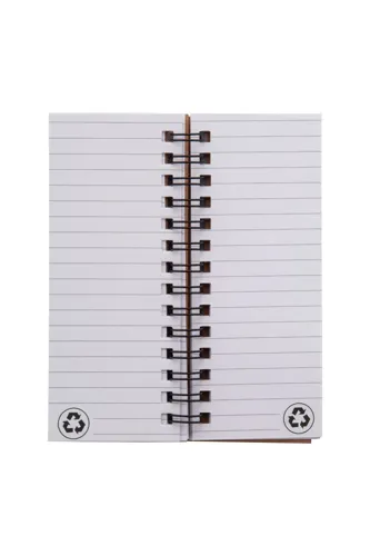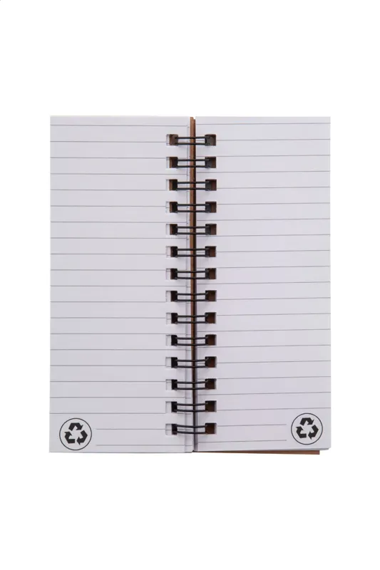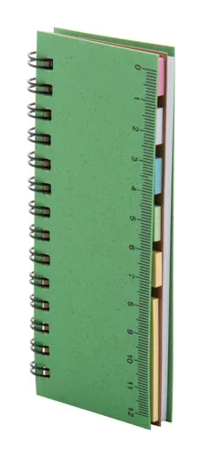 Ökológiai búzaszalma műanyag borítású spirálfüzet 40 vonalas lappal újrahasznosított papírból, 25 öntapadós jegyzetlappal és 125 oldaljelölővel (5 különböző színben). 12 cm-es vonalzóval a borítón.