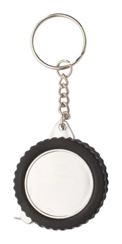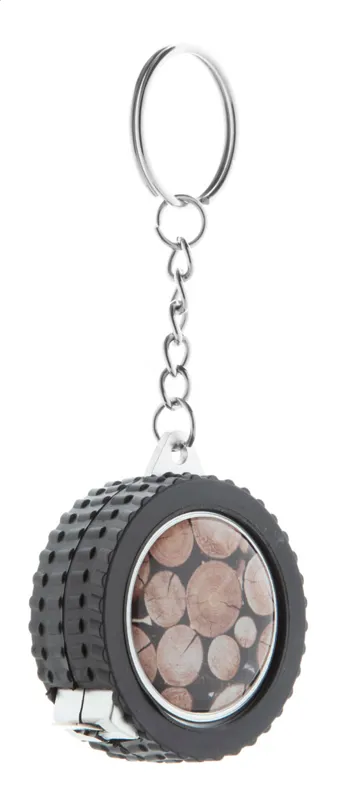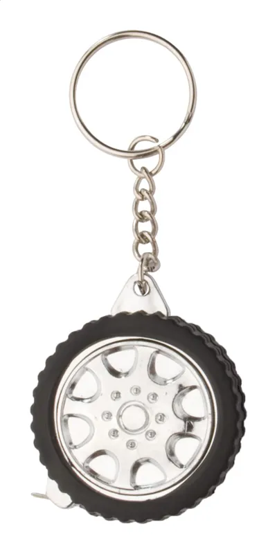 Kerék alakú fém kulcstartó 1 m hosszú mérőszalaggal.