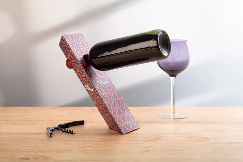 Egyediesíthető, full colour grafikával ellátott, hullámkartonból készült egyensúly borosüvegtartó. Lapra szerelve szállítjuk. Minimális rendelési mennyiség: 50 db.