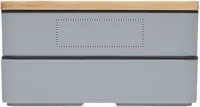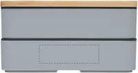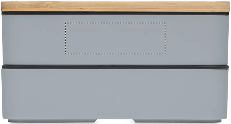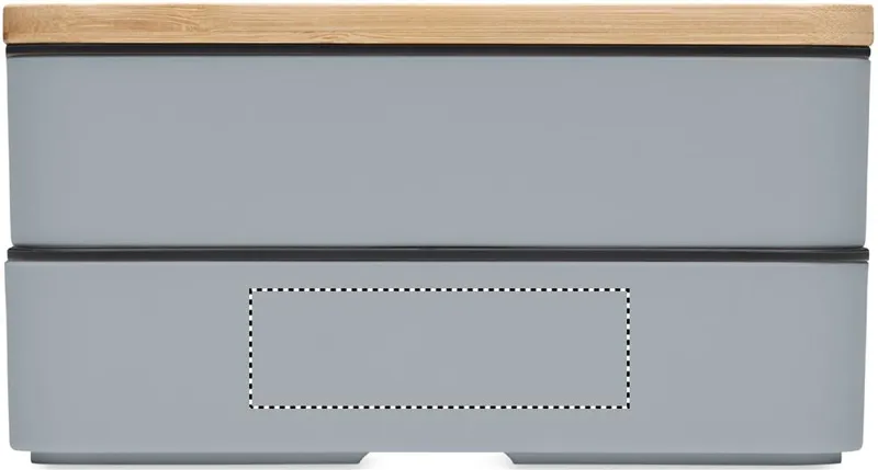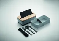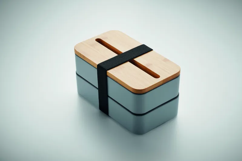 PP kétszintes uzsonnásdoboz kivehető elválasztóval, 3 evőeszközzel, a fedelet rögzítő poliészter pánttal, bambusz fedéllel. A fedélen telefonállvány funkcióval. Űrtartalom: 2 x 400 ml. A bambusz természetes anyag, színében, mintázatában és méretében esetenként eltérő lehet. Szivárgásmentes.