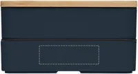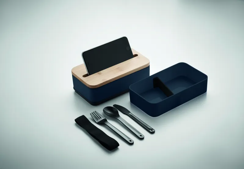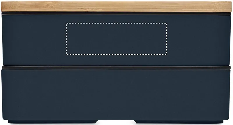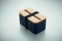 PP kétszintes uzsonnásdoboz kivehető elválasztóval, 3 evőeszközzel, a fedelet rögzítő poliészter pánttal, bambusz fedéllel. A fedélen telefonállvány funkcióval. Űrtartalom: 2 x 400 ml. A bambusz természetes anyag, színében, mintázatában és méretében esetenként eltérő lehet. Szivárgásmentes.