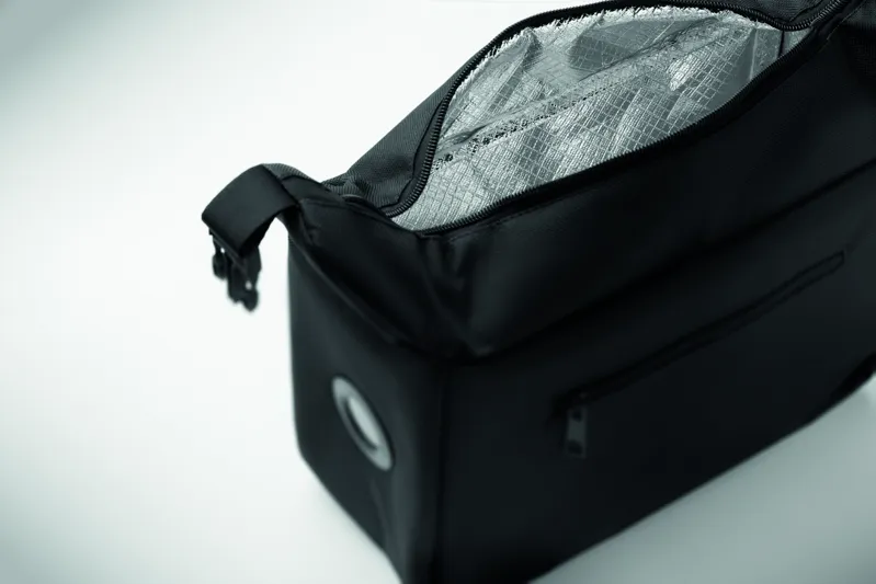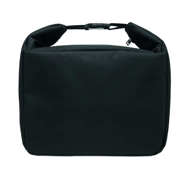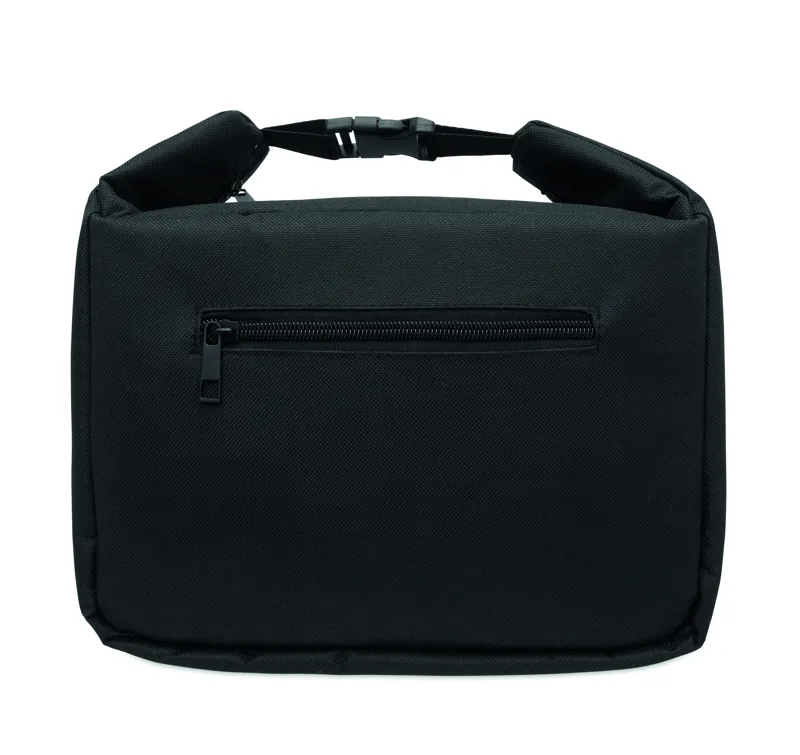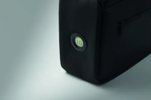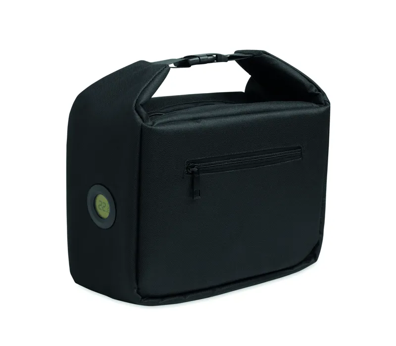 Uzsonnás hűtőtáska belső hőmérséklet kijelzővel, 600D RPET anyagból, 3 mm PE habbal, alumínium fólia béléssel. Csatos záródás, cipzáras fő rekesz és oldalsó zseb. Űrtartalom: 10 l.
